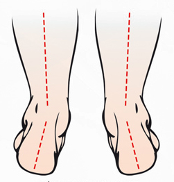 | Στην περίπτωση των ενωμένων γονάτων (βλαισοποδία), τα πόδια στρέφονται προς τα μέσα κατά τρόπον ώστε τα γόνατα να βρίσκονται σε επαφή και τα πέλματα να μένουν ανοικτά. |